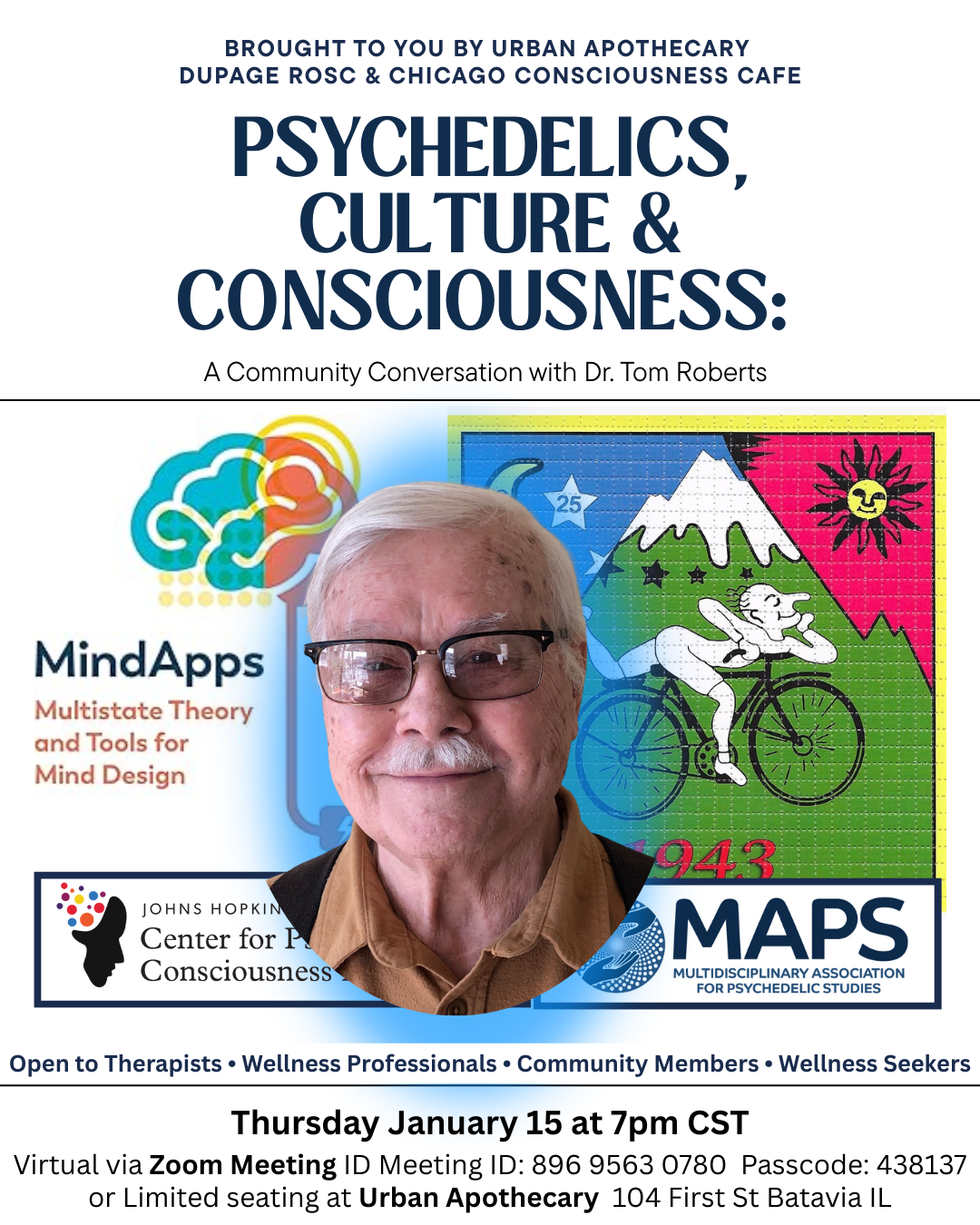 Join us for an evening of thoughtful dialogue with Dr. Tom Roberts, a pioneering voice in psychedelic studies and consciousness research.
